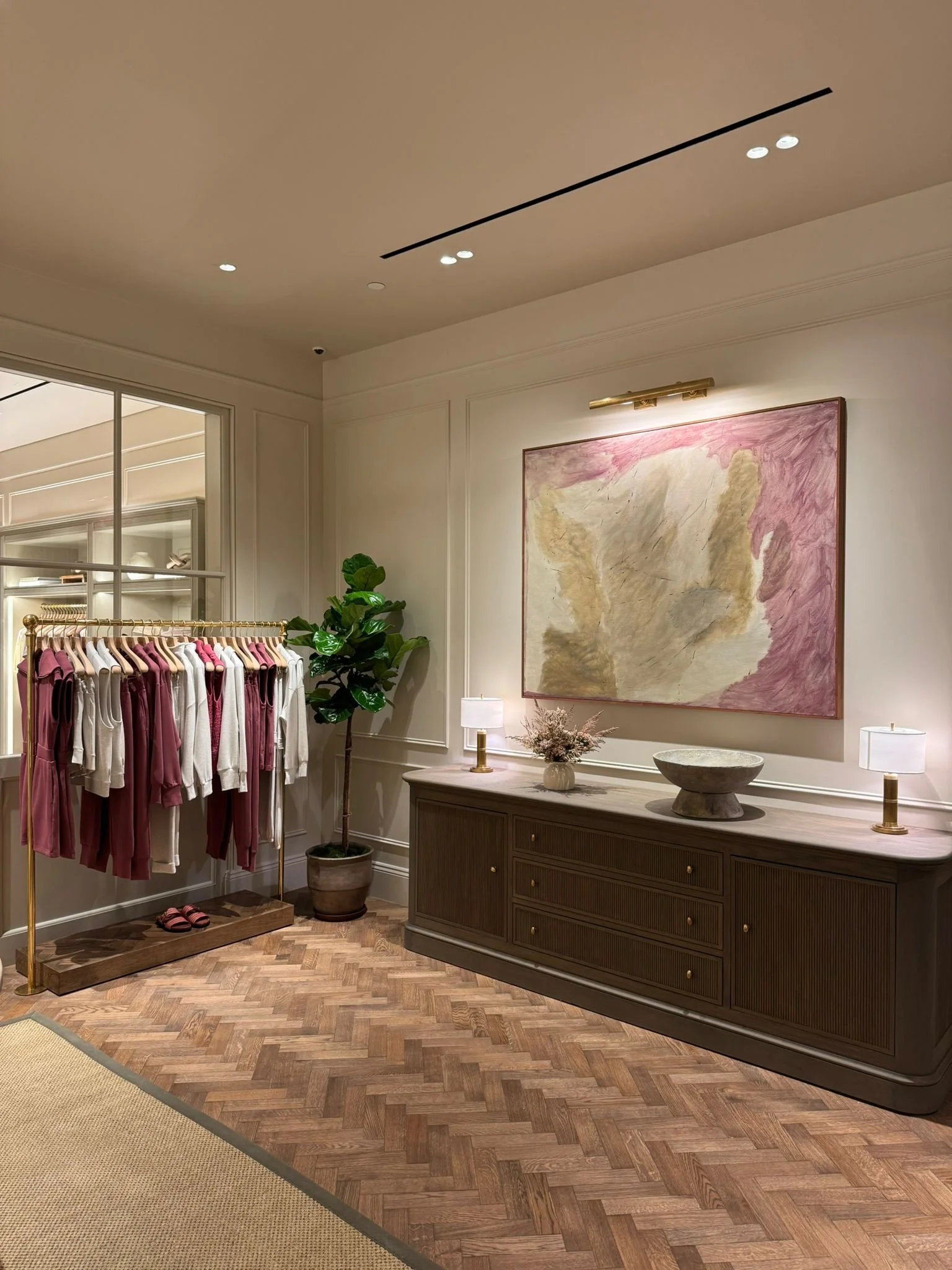 For several years C&B has worked closely with the owners of Varley to create a body of work from a roster of female artists within their stores worldwide. Each painting, collage, textile and work on paper is influenced by the colour palette and soft lines of Varley clothing, and weaves a narrative that aligns with the brand's values, celebrating female empowerment and femininity. We want to give customers the sense of arriving at a home rather than a commercial store, one in which the artwork collection has been carefully curated and built over time.
